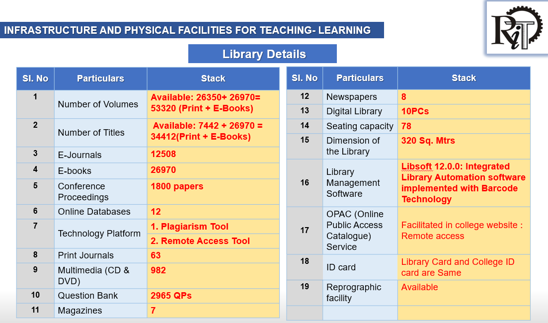 RIT Library established the ‘Institutional Repository’ which has e-books, Question Papers and faculty publications, and Project reports to access remotely.